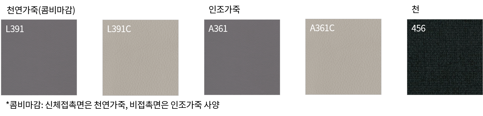| 색상 | 천연가죽(콤비마감) : L391, L391C / 인조가죽 : A361, A361C / 천 : 456 |